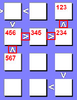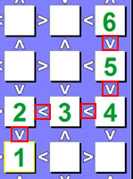 | In this example we will test the 3 in the 4th box. If we set the 4th box to 3, then that would force the 5th box to a 2 because 3 > 2. It will also force the 3rd box to a 1 as well because of the inequality rules and because we already used a 2. So now between the 3rd, 4th and 5th boxes you have 1, 3 and 2 respectively. But this presents a problem with the 7th box which only allows 1, 2 or 3 to be used. As a result this would cause a duplicate value in the same row (or column), so we can remove 3 as a possibility from the 4th box. |