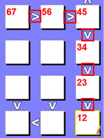 | In this example we will test the 4 in the first box. If we set the first box to 4, then that would force the 2nd box to a 5 because 4 < 5. It will also set the 4th box to 5 as well because it can't be a 4. You run into a problem where 2 boxes are a 5 in the same row and that is not allowed. So therefore, we can remove 4 as a possibility |