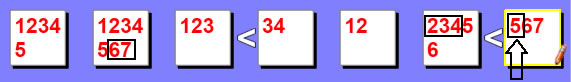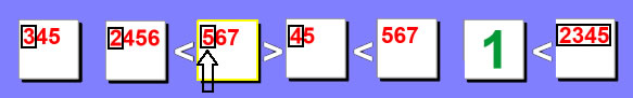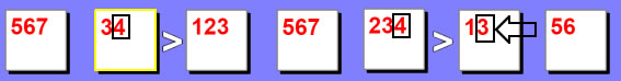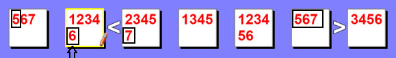 | In this example we will test the 6 in the 2nd box. If we set the 2nd box to 6, then that would force the 3rd box to a 7 because 6 < 7. It will also set the 1st box to 5 as well because it can't be a 6 or a 7. So now between the 1st, 2nd and 3rd boxes you have 5, 6 and 7. But this presents a problem with the 6th box which only allows 5, 6 or 7 to be used. As a result this would cause a duplicate value in the same row (or column), so we can remove 6 as a possibility from the 2nd box. |